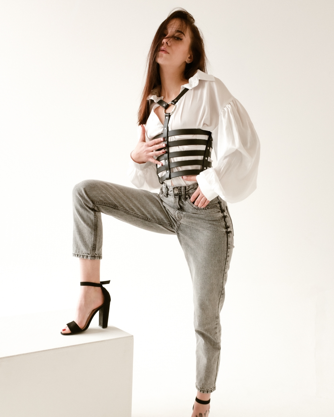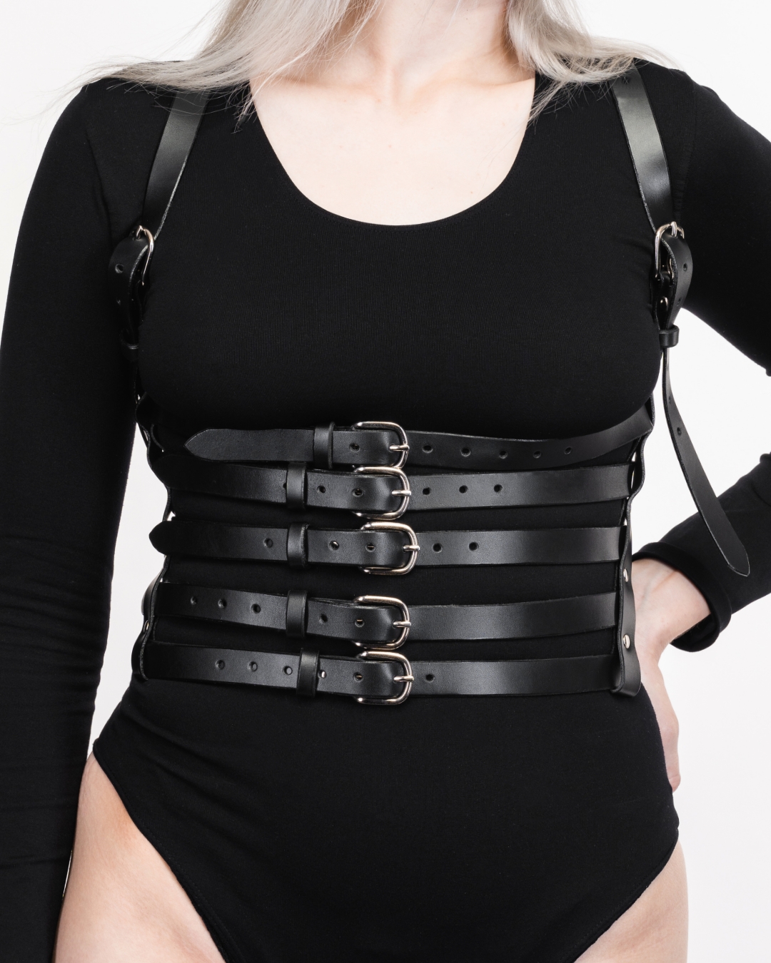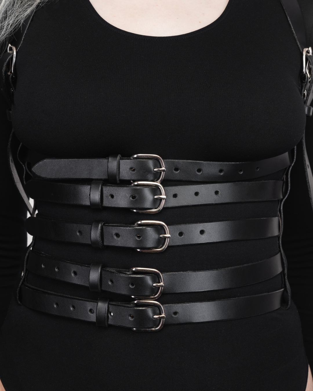 Modulární harness se šesti odnímatelnými pásky a ramenními popruhy. Lze nosit oboustranně, přizpůsobit výšku i počet řemenů.