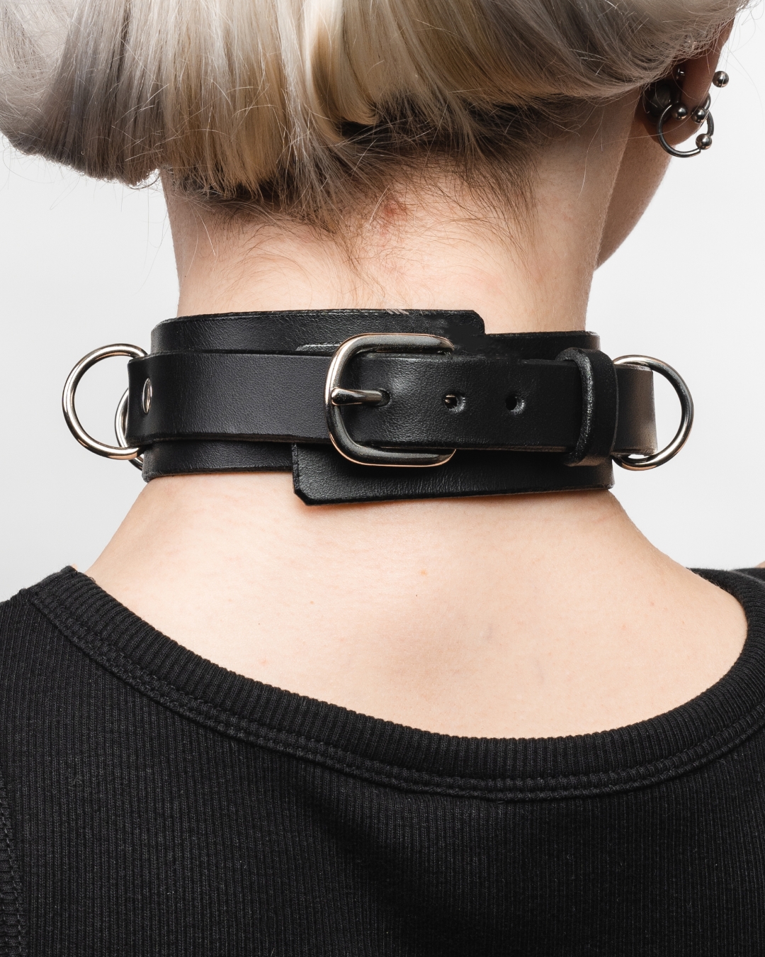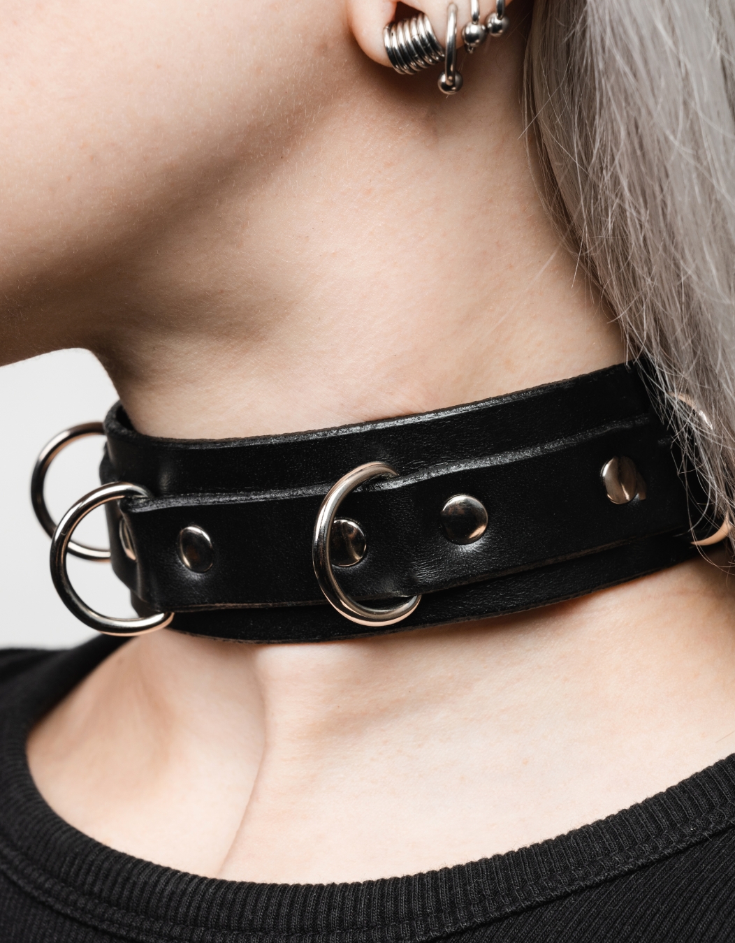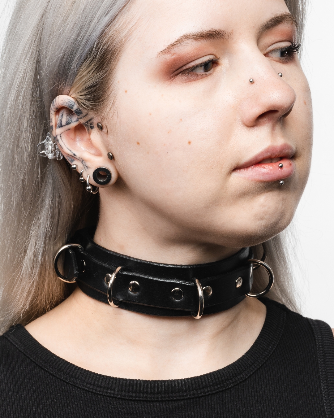 Širší kožený obojek s pěti kovovými polokroužky. Dvouvrstvý, pevný, ale elegantní.