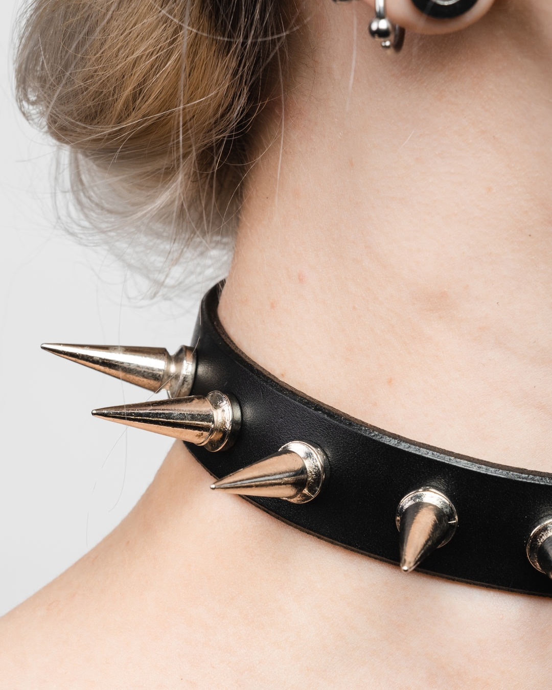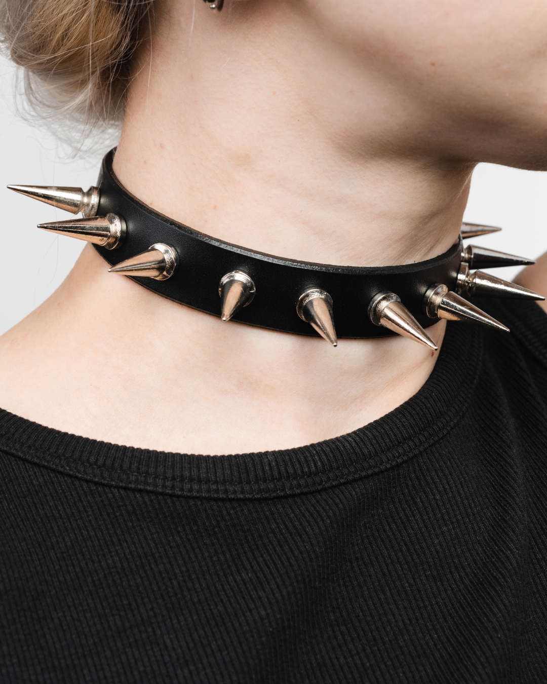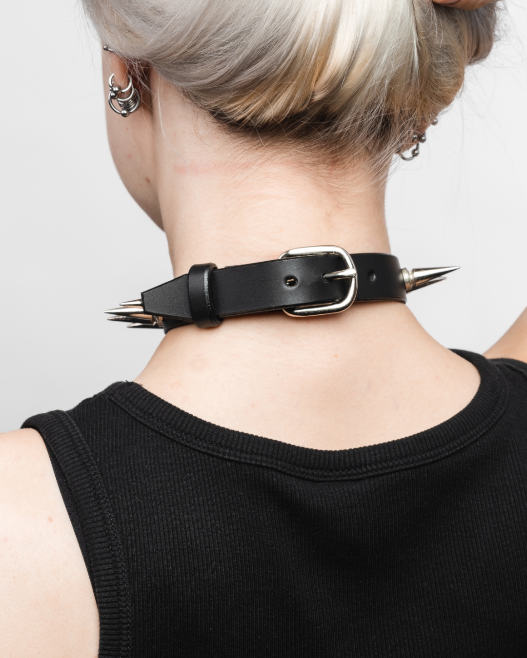 Úzký obojek s hustě osazenými krátkými ostny. Výrazný, lehký, ostře stylový.