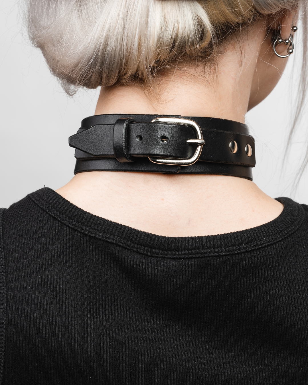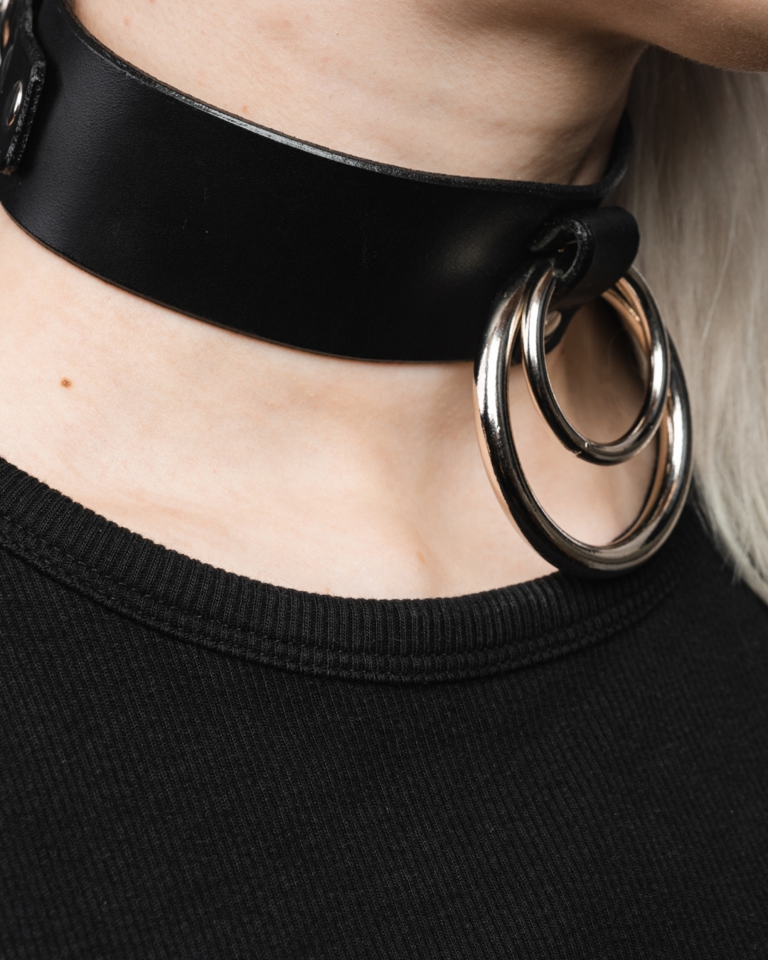Kožený obojek s dvěma kovovými kruhy.
