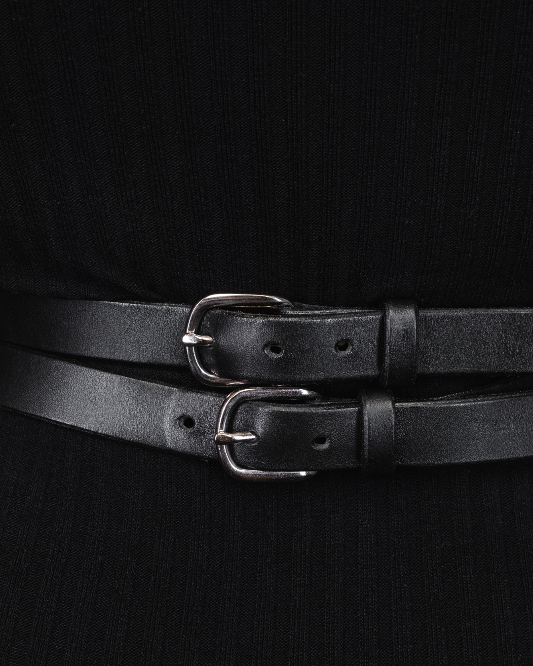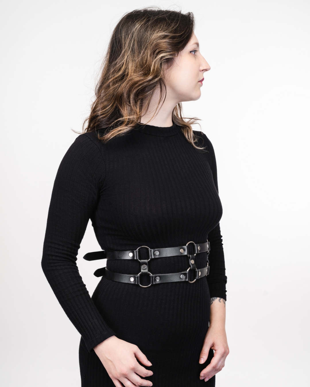 Strukturální kožený opasek složený ze dvou pásů propojených kovovými oky a řemeny. Skvěle tvaruje siluetu a opticky zvýrazňuje pas.
